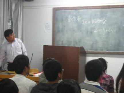 2011年10月20日下午,数学系在1305教室召开了考研及就业座谈会,数学系主任赵临龙教授,系学工办主任马新华,教师陈立强、武海辉等4位教师及09级本科班及10级员工共80余人参加了座谈会。