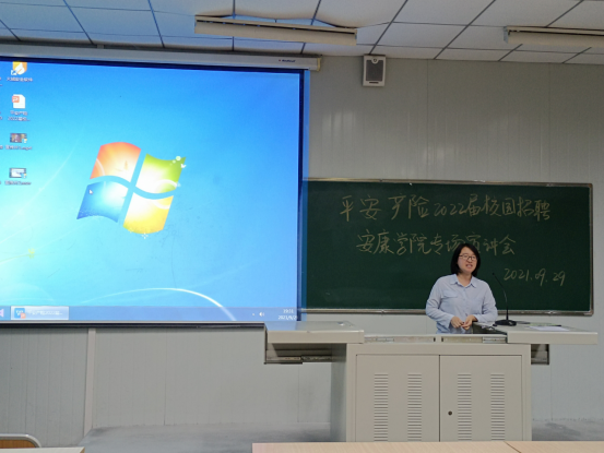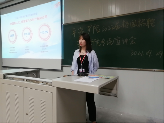 平安产险招聘人员介绍了公司业务范围,包括金融服务、医疗健康、汽车服务、智慧城市,接着对安康中心支公司的发展历程和规模进行了介绍。随后分享了自己在公司的成长经历,就员工关心的岗位需求、薪资待遇、激励和福利政策、晋升渠道等进行着重简介。宣讲结束后的交流环节,到场同学和招聘人员进行了详细的沟通。