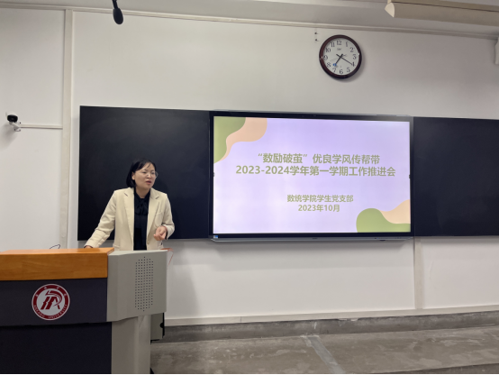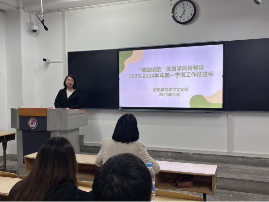 董婷瑜对员工支部“数励破茧”优良学风传帮带特色工作的基本情况进行了介绍:支部该特色工作经历了一对一帮扶、优良学风传帮带两个阶段,本学期又开辟了“每日一题”线上专栏。通过发挥奖学金获得者的标杆作用,跨年级互动,实现“传帮带”,帮助学困生实现学业进步,促进公司员工形成浓厚的学习气氛。董婷瑜向主讲人和受众分别提出要求,奖学金获得者作为主讲人应认真备课,和受众在专业课知识点、学习方法等各方面积极交流,在帮助他人进步的同时获得自我成长。各班班委协助维持秩序,引导同学们认真学习,同时积极参与“每日一题”线上专栏活动,抓住“送课到身边”的机会,向主讲人学习经验,提高学业成绩。