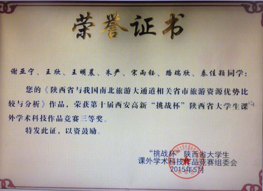 此次竞赛历时三个多月,经过公司专家评审,校内决赛秘密答辩等环节,数统系有2件作品被选送参与全省联评。在赵临龙、张远秀老师指导下,谢亚宁、王欣 、王明晨、 朱严、 宋雨钰、 路瑞欣、 秦佳颖同学的作品《陕西省与我国南北旅游大通道相关省市旅游资源优势比较与分析》荣获三等奖。