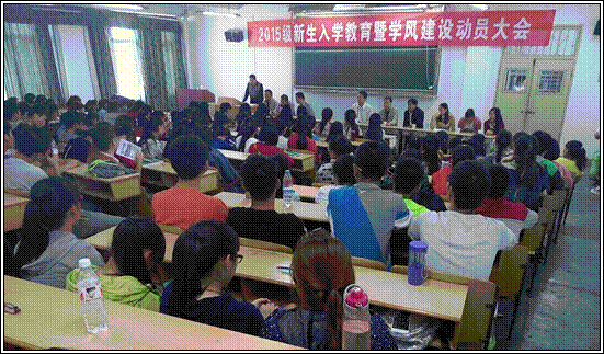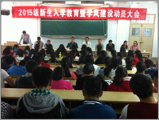 2015年10月15日下午,我系在1号教学楼1510教室举办2015级新生入学教育暨学风建设动员大会。参加这次大会的有系主任赵临龙,党总支书记郭全寿,副主任汪义瑞、王昭海,学工办主任马新华,辅导员王宗庆、张远秀,教学秘书师帅,15级班主任陈立强、宋丽影,13、14级优秀员工以及2015级全体新生。