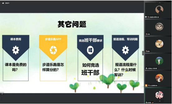 为使2022级新生提前了解老员工活,帮助新生做好规划,365英国上市公司于2022年9月9日晚召开“答疑解惑、助力起航”线上会议会议,对新生感兴趣的大学学习、生活、校园环境等各方面情况进行答疑解惑。本次会议是公司新生入学教育系列活动之一,新生辅导员董婷瑜、刘佩、马勇、高年级员工、2022级全体新生参加了会议。