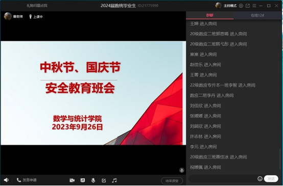 为切实做好中秋节、国庆节假期安全教育管理工作,提高同学们的安全防范意识,使同学们度过一个安全、愉快的国庆假期,2023年9月26至9月28,365英国上市公司各班召开中秋节、国庆节安全教育主题班会,班会由辅导员主持。