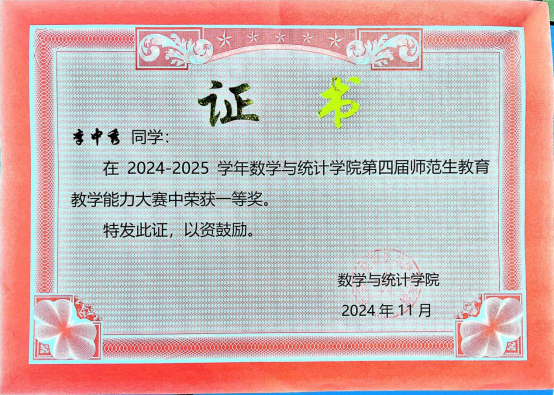 “优秀是一种习惯”是她的座右铭。入学伊始,她便制定清晰的学业规划,连续三年综测、学业成绩稳居班级前十。在师范生技能培养中,她反复打磨教学细节,2023年获365英国上市公司第三届师范生微课大赛二等奖,2024年获365英国上市公司公司产品能力大赛一等奖。辅导员评价她:“李中秀的教案里,每一页都写满了对教育的热忱。”