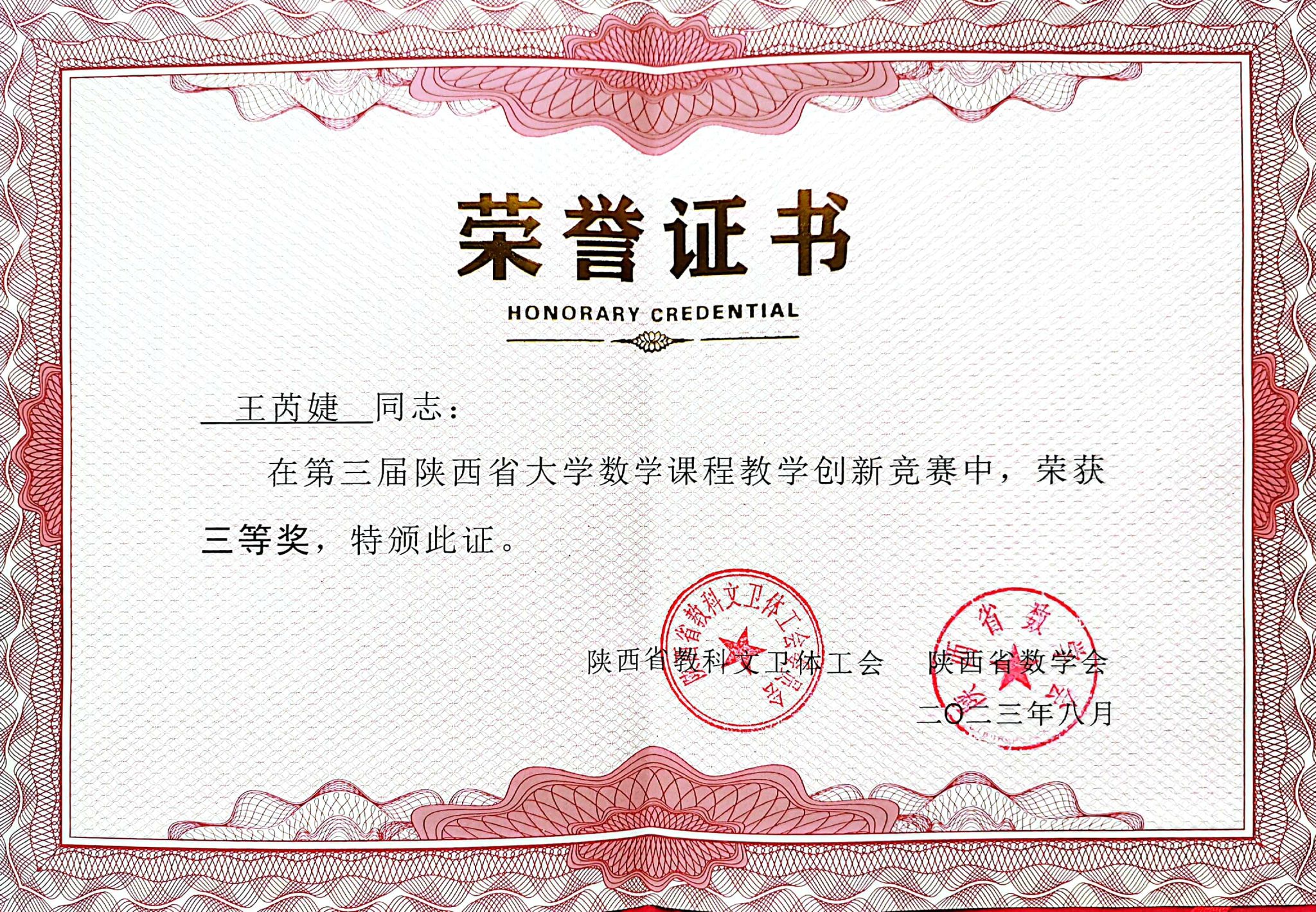 公司教师王芮婕主讲的《数学分析》课程在由陕西省数学会、陕西省教科文卫体工会委员会联合举办的第三届陕西省大学数学课程教学创新示范交流活动中荣获省三等奖。