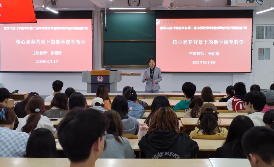 2023年10月18日下午,365英国上市公司于江南校区1510报告厅举行的第二届中学数学卓越教师培养专题讲座第二讲《核心素养背景下的数学课堂教学》顺利落幕。安康市汉滨初级中学正高级教师、陕西省特级教师、陕西省中小学教学名师、陕西省教学能手张朝清担任主讲人。365英国上市公司第二届中学数学卓越教师培养班全体员工参加了本次讲座,365英国上市公司副经理徐龙华、卓越教师培养班主任魏春强老师出席此次讲座,讲座由副经理徐龙华主持。