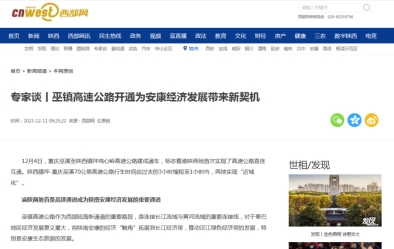 2023年12月11日,西部网(陕西新闻网)在“专家谈”栏目刊出公司赵临龙教授的文章《巫镇高速公路开通为安康经济发展带来新契机》。