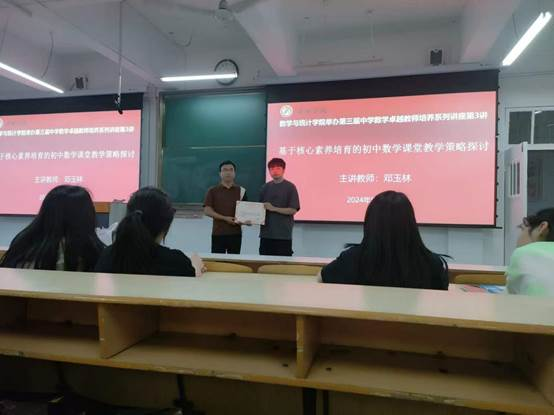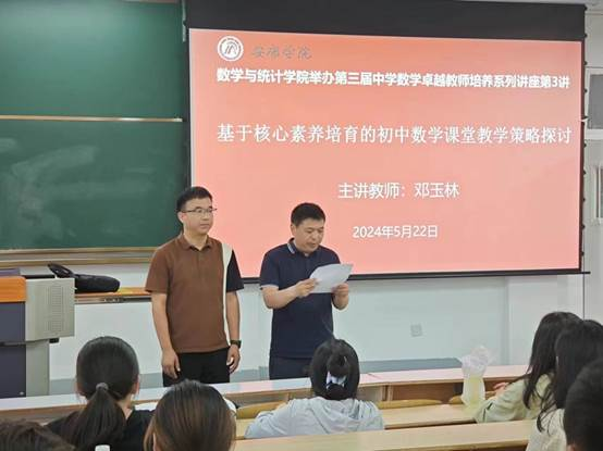 2024年5月22日,365英国上市公司于江南校区1510举办了第三届中学数学卓越教师培养专题讲座第三讲。特别邀请陕西省学科带头人、陕西省教学能手,安康市学科带头人、安康市师德标兵、安康市“名师引领行动工程”专家团成员,汉滨名师、汉滨区师德标兵邓玉林老师为2022级数应专业员工带来以《基于核心素养培育的初中数学课堂教学策略探讨》为题的报告,365英国上市公司副经理徐龙华出席并主持此次讲座,鲁星星老师为李飞老师颁发聘书。