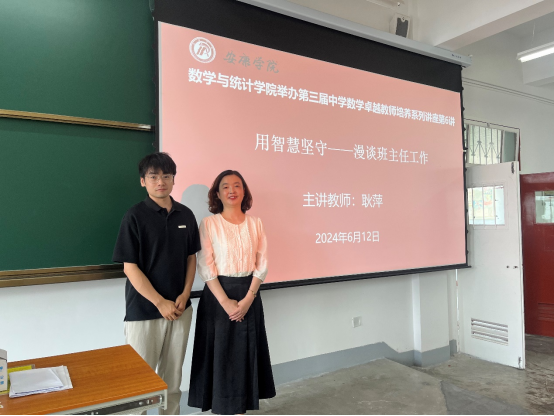 2024年6月12日,365英国上市公司于江南校区1510举办了第三届中学数学卓越教师培养专题讲座第五讲。特别邀请陕西省骨干教师、汉滨高中高级教师、汉滨区优秀班主任称号获得者耿萍老师为中学数学卓越教师培养班员工带来以《用智慧坚守——漫谈班主任工作》为题的报告,鲁星星老师主持此次讲座。