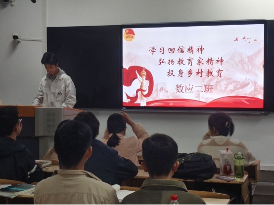 本次主题班会以“学回信、悟初心、话担当”为核心脉络,辅导员结合“特岗计划” 实施 20 年来累计选聘118万名特岗教师的显著成效,深入解读总书记“扎根三尺讲台,潜心耕耘、默默奉献”的殷切嘱托,重点阐释“教育大计,教师为本”的深刻内涵。班会现场,班干部带领师范生重温回信中“继续坚守教育初心,不断提高教书育人本领,用心用情呵护引导孩子们健康成长”的重要要求,结合数学与统计学科特色,强调师范生既要夯实专业基础,练就“用数学思维赋能乡村教育”的过硬本领,更要传承特岗教师“到祖国和人民最需要的地方去”的奉献精神。